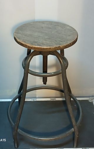 Sgabello dal design industriale, perfetto per officine o spazi creativi. - Seduta rotonda in legno. - Struttura in metallo verniciato. - Altezza regolabile tramite vite centrale.