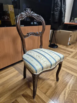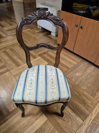 Vendo 6 sedie stile Luigi Filippo. Condizioni perfette. Altezza schienale: 104cm Altezza seduta: 48cm Larghezza seduta: 37-48cm Profondità seduta: 47cm Tutte le 6 sedie in blocco: 200 Euro (circa 33 Euro l'una)