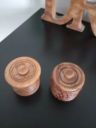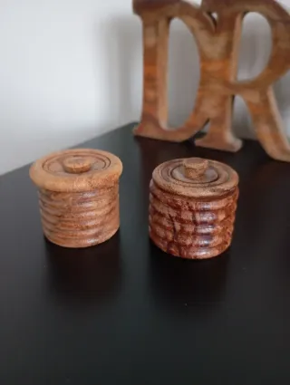 Set di due piccoli barattoli decorativi con coperchio. - Misura indicativa cm 3 di altezza e diametro - Realizzati in legno.
