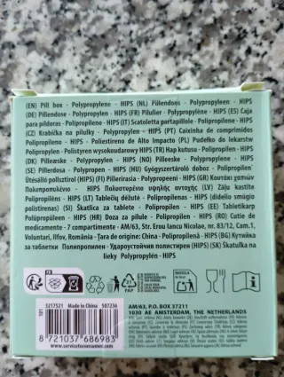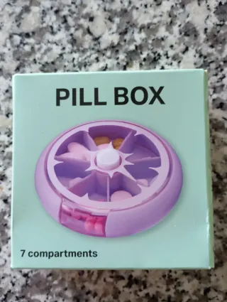 Portapillole rotondo con 7 scomparti per organizzare le tue medicine. - Confezione ancora sigillata. - Diametro 9 cm. - Design compatto e pratico. - Ideale per viaggi o uso quotidiano.