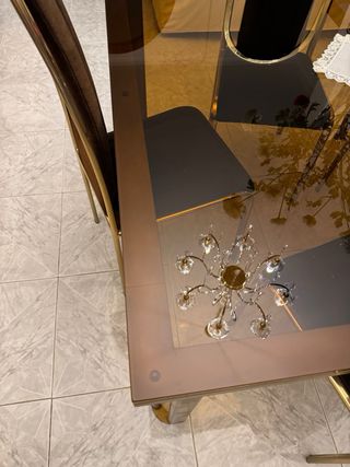 Elegante set composto da un tavolo da salone con piano in vetro fumè e gambe in metallo color oro, accompagnato da quattro sedie. Il tavolo presenta sulla doratura soli alcuni segni di usura - Piano del tavolo in vetro fumè lucido. - Struttura delle sedie in metallo dorato. - Sedute delle sedie rivestite in pelle di renna nera