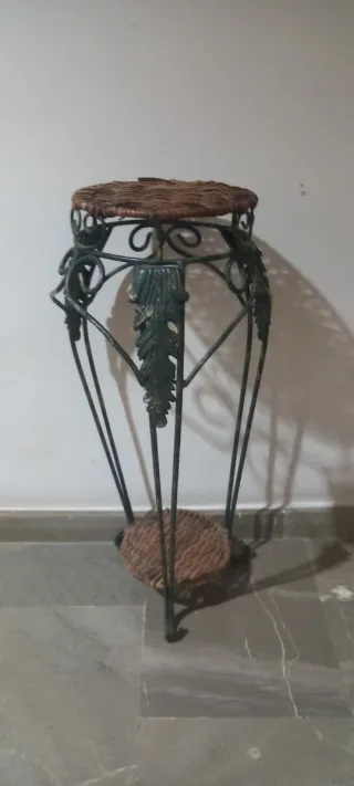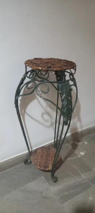 Elegante portavasi in stile vintage, perfetto per dare un tocco speciale alla tua casa. Struttura in metallo con dettagli ornamentali. Sedute in vimini nella parte superiore e inferiore. Design a forma di lira con foglie decorative.