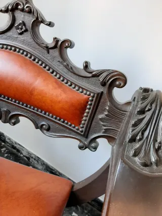 Elegante coppia di sedie in stile vintage, perfette per aggiungere un tocco di classe alla tua casa. - Sedute e schienali imbottiti con tessuto floreale. - Struttura in legno scuro con dettagli intagliati. - Gambe tornite e finiture con borchie decorative. Altezza schienale 80 Altezza seduta 40