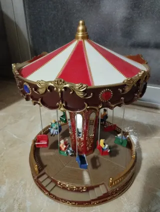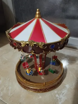 Carosello di sedie volanti con un design incantevole. Decorazione dettagliata in toni rossi e dorati. Figure di persone sedute sulle sedie. Base circolare con effetto legno.
