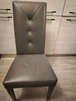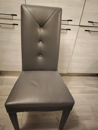 Set di sedie per un totale di numero 4 sedie, usate, ancora utilizzabili, presentano si segni di usura, anche la mancanza di qualche bottone nella spalliera, quest'ultimo difetto risolvibile prendendo dei bottoni sostitutivi, una delle sedute presenta delle crepe. Allego foto