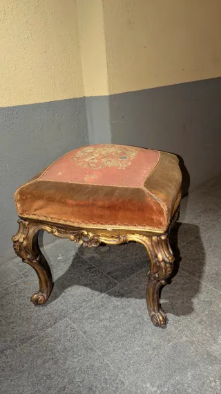 Coppia di sgabelli dorati con velluto, anni ’20 Attenzione il prezzo e la spedizione sono per un unico sgabello! Sgabelli originali degli anni 1920, impreziositi da una finitura in oro matto applicato a foglia. L’eleganza del decoro si combina con la morbidezza del rivestimento in velluto, in una tinta che valorizza la struttura scolpita. Ideali come sedute da appoggio o elementi decorativi in interni classici o eclettici, sono perfetti per chi cerca autenticità e raffinatezza nei dettagli d’arredo. Ritiro a mano in zona Brera o De Angeli Parole chiave aggiuntive: sgabelli antichi, velluto d’epoca, mobili dorati, sedute imbottite,
