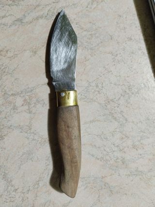 coltello artigianale sardo fatto interamente a mano dal maestro coltellinaio Edoardo Olla. Manico in pezzo unico di legno tutto lavorato e formato a mano, anello in ottone, lama in acciaio inossidabile tutta lavorata a mano. Pezzo unico. lunghezza 23,5 cm, lunghezza lama 10,5 cm.