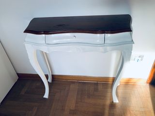 Consolle da parete in legno laccato bianco. Piccolo cassetto anteriore. Misura cm 79,5 x 30 x H 75. Vecchio stile ma rimodernata con la laccatura, si abbina bene anche con l'arredo moderno. - Piano in legno scuro. - Struttura bianca con gambe curve. - Un cassetto centrale.