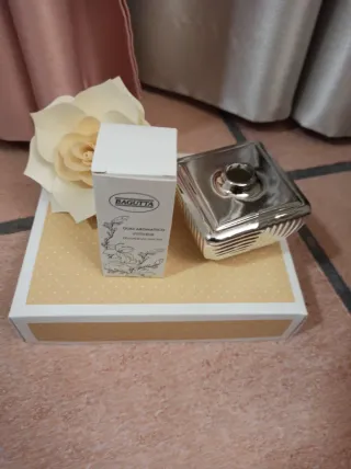 Elegante profumatore Bagutta, perfetto per aggiungere un tocco di stile alla tua casa. Include un diffusore e un fiore decorativo. - Profumatore Bagutta - Diffusore in metallo argentato - Fiore decorativo in carta color crema - Scatola decorata con pois