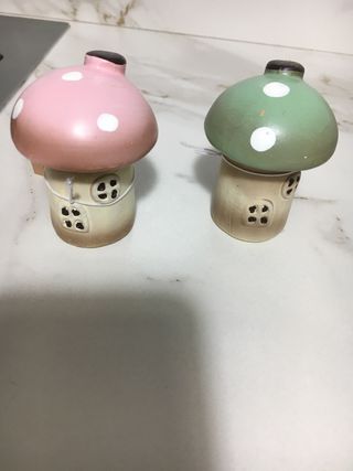 Set di due decorazioni a forma di fungo in ceramica, perfette per aggiungere un tocco di colore alla tua casa. - Un fungo è di colore rosa con pois bianchi. - L'altro fungo è di colore verde con pois bianchi. - Entrambi presentano dettagli che ricordano una casetta con finestre.