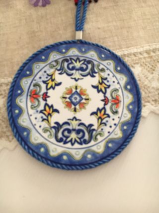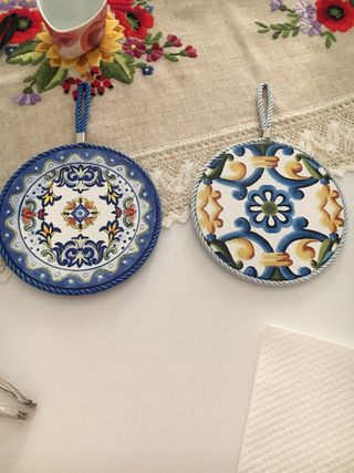 Set di due decorazioni rotonde in ceramica, perfette per aggiungere un tocco di colore alle pareti. - Design con motivi floreali e geometrici. - Cordino per appenderle incluso.
