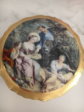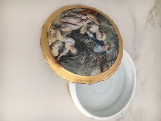 Elegante porta cioccolatini in ceramica, perfetto per servire dolcetti. - Decorazione dipinta a mano con scena pastorale. - Bordo dorato con motivo floreale. - Forma lobata.
