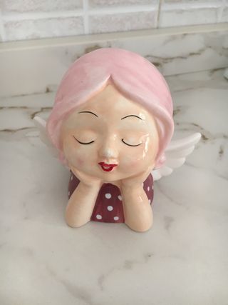 Deliziosa statuetta decorativa a forma di angelo con capelli rosa e dettagli rossi. - Realizzata in ceramica. - Design con ali bianche e vestito a pois. - Viso sereno con occhi chiusi e labbra rosse.