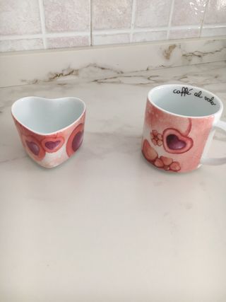 Set composto da una tazza mug e un portabiscottini a forma di cuore, entrambi con una graziosa decorazione a tema floreale e cuori. - Tazza con scritta caffè al volo - Portabiscottini a forma di cuore