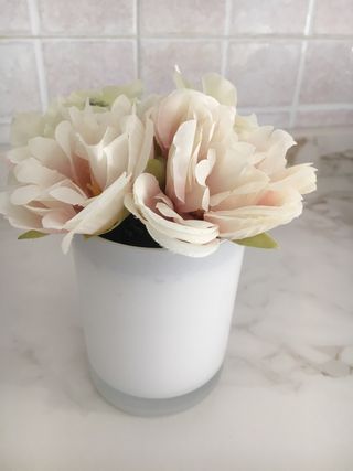 Delicato vasetto con fiori in stile shabby chic, perfetti per aggiungere un tocco di eleganza alla tua casa. - Fiori in tessuto con sfumature rosa e bianche. - Vaso bianco opaco.