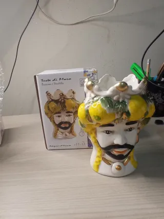 Coppia di teste di moro decorative, perfette per aggiungere un tocco di stile alla tua casa. Queste ceramiche artistiche sono un'icona del design siciliano. - Altezza: 13 cm - Design ispirato alle tradizionali teste di moro - Finitura multicolore vivace