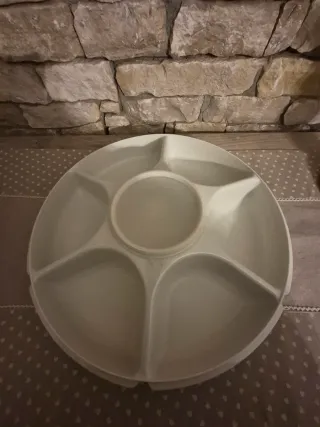 Elegante vassoio per servire antipasti, stuzzichini o finger food. Ideale per feste e buffet. - Sei scomparti per diverse pietanze. - Design circolare con un contenitore centrale. - Realizzato in materiale resistente.