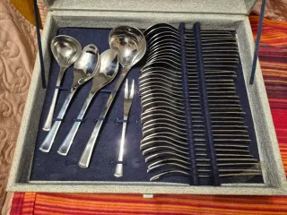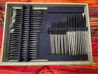 Elegante set di posate in metallo, ideale per occasioni speciali o per arricchire la tavola di tutti i giorni. Il set è contenuto in una pratica valigetta. Set posate - Posate in metallo lucido. - Valigetta foderata in tessuto blu.
