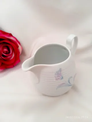 Elegante lattiera vintage in porcellana, un pezzo da collezione. - Design con delicati motivi floreali. - Bordi ondulati per un tocco raffinato. - Spedizione disponibile.