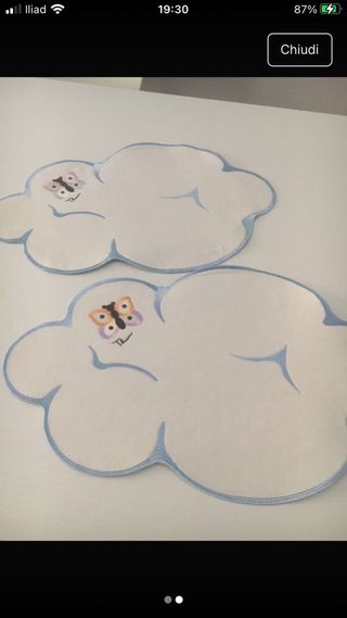 Set di due tovagliette Thun con un allegro disegno a forma di nuvola e una farfalla colorata. - Design a forma di nuvola. - Decorazione con farfalla. - Bordo azzurro.