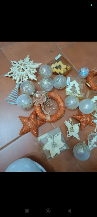 Set di decorazioni per l'albero di Natale, perfette per creare un'atmosfera festosa. - Un elegante fiocco di neve come puntale. - Diverse palline decorative con dettagli dorati. - Elementi a forma di stella per completare l'addobbo.