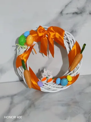 Deliziosa ghirlanda decorativa, perfetta per la Pasqua. Realizzata con una base intrecciata e decorata con elementi a tema. - Due coniglietti bianchi con carote. - Uova colorate e scintillanti. - Fiocco arancione. - Carote decorative.