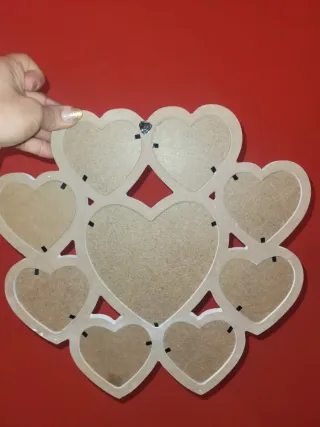 Deliziosa cornice portafoto a forma di cuori, perfetta per conservare i tuoi ricordi più belli. - Design a forma di fiore con cuori. - Posizionamento centrale per una foto più grande. - Struttura in legno.