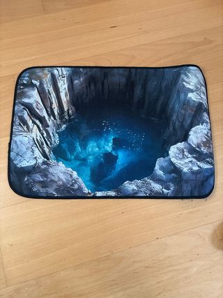 Tappetino con una stampa 3D che crea un suggestivo effetto di profondità, come un abisso marino. - Design unico con paesaggio roccioso e acqua blu. - Materiale in poliestere resistente. - Bordi rifiniti con cucitura nera.