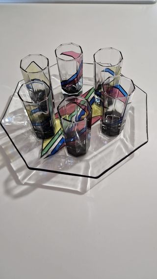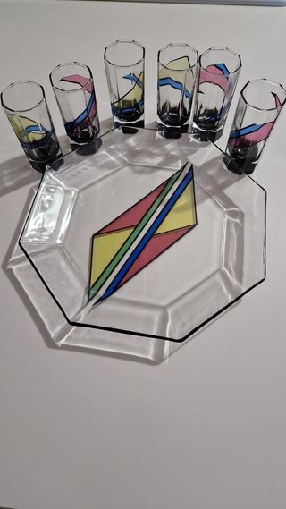 Set bicchierini in vetro con inserti colorati completo di piattino. Altezza 8,5 cm.