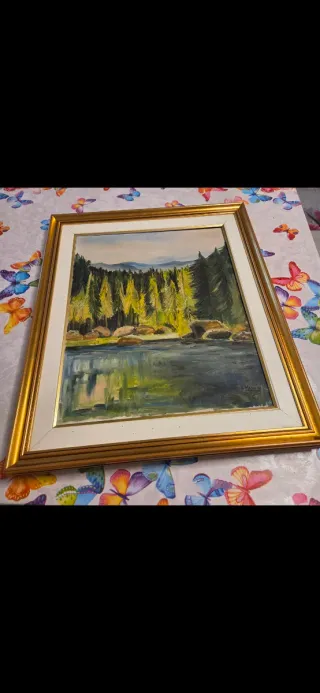 Dipinto raffigurante un paesaggio di montagna con un lago e un bosco. Dimensioni: 63x53 cm - Cornice in legno dorato. - Tela con colori vivaci.