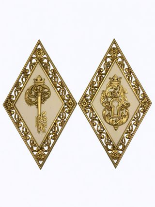 Set di 2 applicazioni da parete vintage anni ‘70, in plastica, in stile barocco, molto decorative ed estremamente scenografiche. Le placche color oro e bianco crema presentano un motivo classico di fiori, foglie, con un motivo tridimensionale color oro al centro. Una ha come tema una chiave, mentre l’altro il buco della serratura. Sono stampate sul retro con la scritta in rilievo "DART IND. Made In USA" . Le targhe misurano circa 35 cm di altezza, 20 cm di larghezza e 2 cm di profondità (vedi foto in mano per avere un’idea visiva della dimensione) e sono in ottime condizioni vintage, senza scheggiature, crepe o di usura.