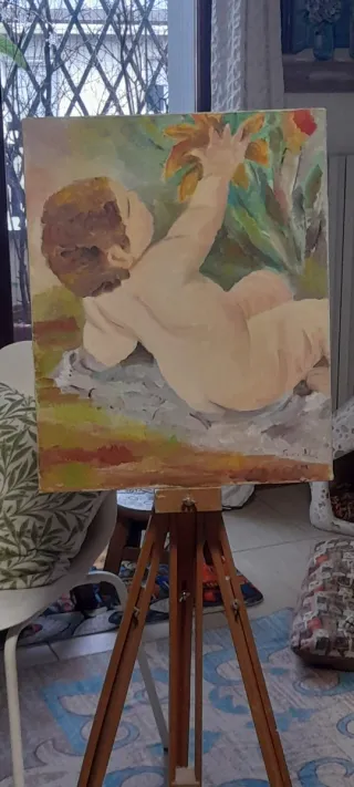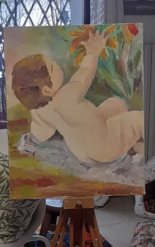 Dipinto originale su tela raffigurante un bambino che cerca di afferrare dei fiori. L'opera presenta colori vivaci e una composizione delicata. Anni '70. 40 cm X 50 cm - Soggetto: Bambino con fiori - Tecnica: Pittura su tela