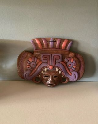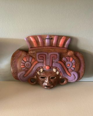 Maschera decorativa da appendere, realizzata in ceramica con finiture colorate. Maschera da parete proveniente dal Messico in terracotta, dipinta a mano, misure 25x17cm - Design ispirato all'arte precolombiana. - Dettagli in rilievo. - Tonalità vivaci che aggiungono un tocco artistico.