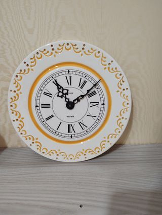 Elegante orologio da parete realizzato in ceramica con dettagli dorati. - Cornice decorata con motivi floreali. - Quadrante con numeri romani. - Finitura lucida.