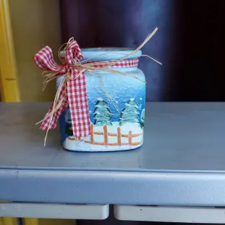 Portacandele decorato con un simpatico pupazzo di neve e un paesaggio invernale. - Decorazione a tema natalizio. - Bordino a scacchi rossi e bianchi. - Fiocco con spago decorativo.
