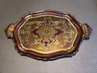 vassoio in legno, dipinto a mano con decoro inciso e finitura in oro anticata.. pezzo vintage anni 60 stile barocco realizzato in legno, con doratura in foglia oro e pittura a mano con tecniche artigianali stole arte fiorentina decoro in rilievo a motivi floreali. presenta qualche segno di usura come da foto misura larghezza 47 cm (52 cm con le impugnature) lunghezza 32 cm .circa