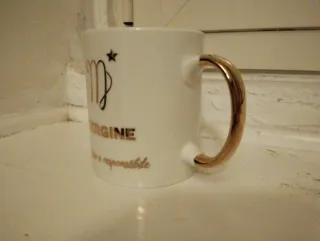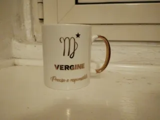 Tazza in ceramica con il segno zodiacale della Vergine. Dimensioni: 10 cm. - Design con simbolo della Vergine e stella. - Scritta VERGINE in color oro. - Frase Preciso e responsabile in color oro. - Manico color oro.