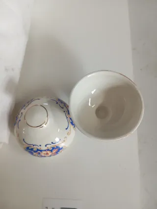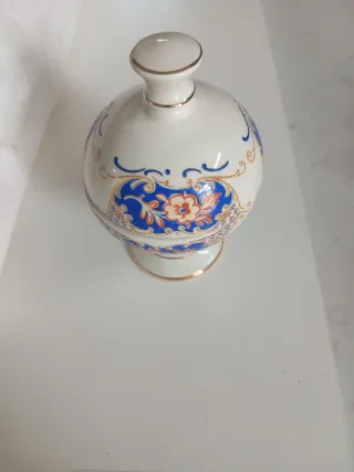 Elegante vaso in ceramica con coperchio, perfetto per aggiungere un tocco di stile alla tua casa. - Decorazione floreale blu e arancione. - Dettagli dorati sul bordo e sul coperchio. - Base a piedistallo.