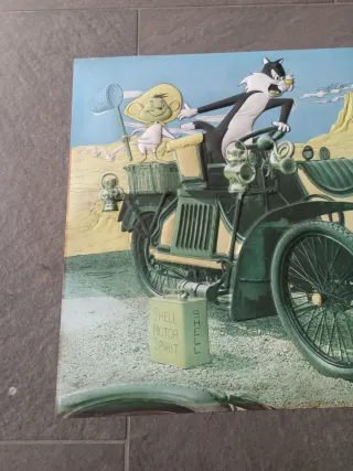 Quadro in rilievo con i personaggi dei cartoni animati Sylvester Tweety Speedy Gonzales - Personaggi: Sylvester, Tweety, Hector e un altro personaggio. - Ambientazione: un'auto d'epoca e un edificio in legno. - Dettagli: latta Shell Motor Spirit, targa N-1003 con 1904. Dimensioni 48 x 67 cm