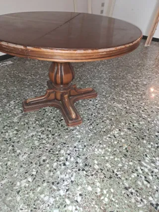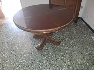 Elegante tavolo vintage rotondo, perfetto per aggiungere un tocco classico alla tua casa. - Gamba centrale a croce per un design stabile. - Piano diviso in sezioni per un eventuale allungamento.