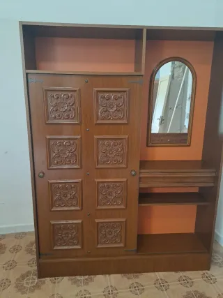 Elegante appendiabiti in legno con un design unico e uno specchio integrato. Perfetto per organizzare i tuoi spazi. - Ante con intagli floreali. - Specchio ovale. - Ripiani a vista.