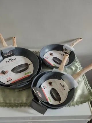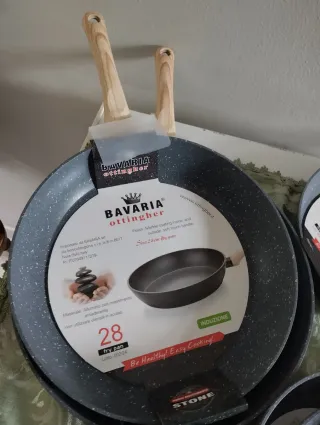 Set di padelle antiaderenti con finitura effetto pietra e manici in legno. - Adatte per piani cottura a induzione. - Rivestimento interno resistente. - Design moderno ed elegante.