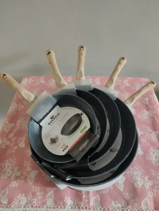 Set di 5 padelle adatte per induzione. - Rivestimento effetto pietra. - Manici in legno.
