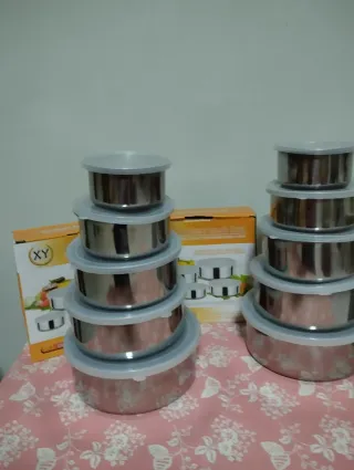 Set di 10 contenitori per alimenti, ideali per conservare cibi. - Corpo in acciaio inossidabile. - Coperchi in plastica. - Diverse dimensioni per ogni esigenza.