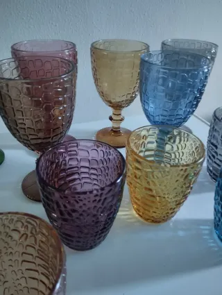Set di bicchieri e calici in vetro, disponibili in diverse tonalità vivaci. 12 Pezzi - Design con texture a rilievo. - Materiale: vetro.