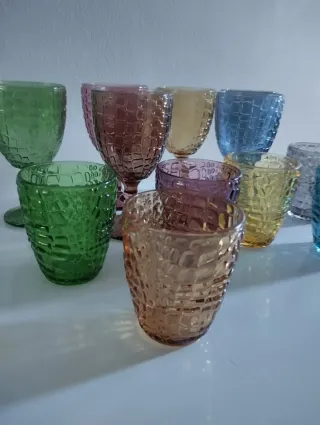 Set di calici e bicchieri in vetro, con una varietà di colori vivaci. - Design con texture a rilievo. - Ideali per ogni occasione.