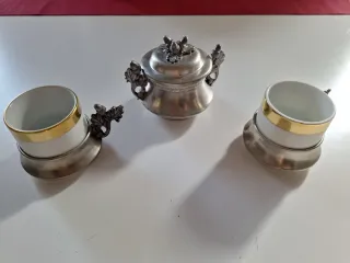 Elegante set composto da due tazzine e una zuccheriera. - Tazzine con finitura dorata in porcellana - Zuccheriera con coperchio decorato. - Base e manici in peltro lavorato. - Condizioni ottime