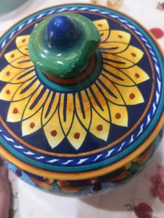 Elegante biscottiera in ceramica, perfetta per conservare i tuoi dolcetti. Dipinta a mano,misura media. Presenta piccola rottura sul pomello (vedi foto),: è stato un po' camuffato . Bellissima Comunque - Decorazioni vivaci e colorate. - Design unico e artigianale.