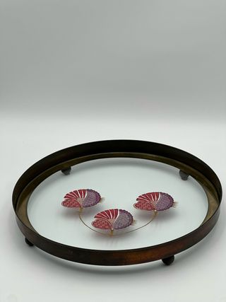 Elegante vassoio rotondo vintage con base in vetro decorato floreale e struttura in metallo brunito/ottone con piedini. Stile Art Déco / Mid-Century (anni 30–50). Ideale come vassoio da servizio o come centrotavola decorativo. Diametro 42 cm, altezza 6 cm. Buone condizioni d’epoca: normale patina sulla struttura metallica, vetro ben conservato.