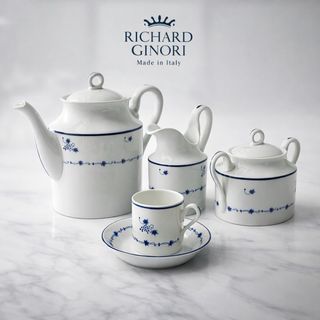 Elegante servizio da caffè in porcellana Richard Ginori, decorazione blu su fondo bianco, stile classico senza tempo. Il set è composto da 12 tazze da caffè con relativi piattini, caffettiera, zuccheriera con coperchio e lattiera coordinata. Produzione italiana di qualità, periodo seconda metà XX secolo (anni ’70–’80). Misure: caffettiera h 18 cm, zuccheriera h 11 cm, lattiera h 13 cm. Ottime condizioni generali. Ideale per collezionisti o per una tavola elegante.